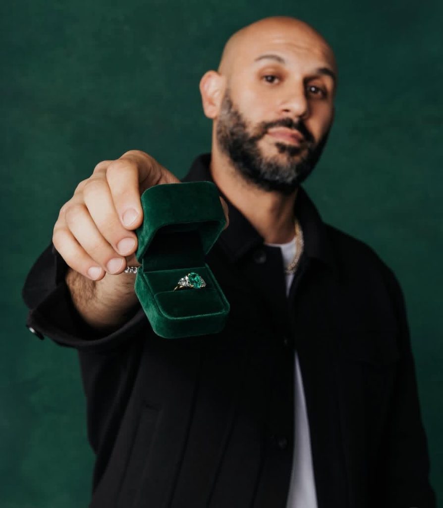 Chime and Greg Yüna created a custom lab-grown diamond ring. The design includes a 3.68-carat emerald-cut center stone. It also features two 1.5-carat side stones in yellow gold. The ring looks luxurious but avoids extreme costs. It promotes thoughtful buying instead of overspending.